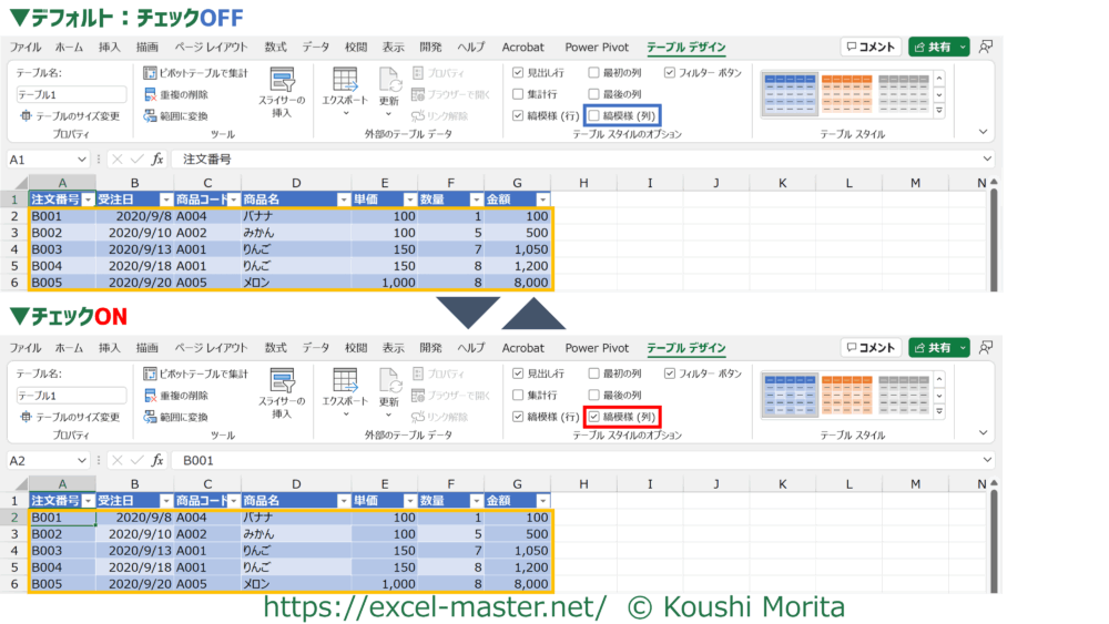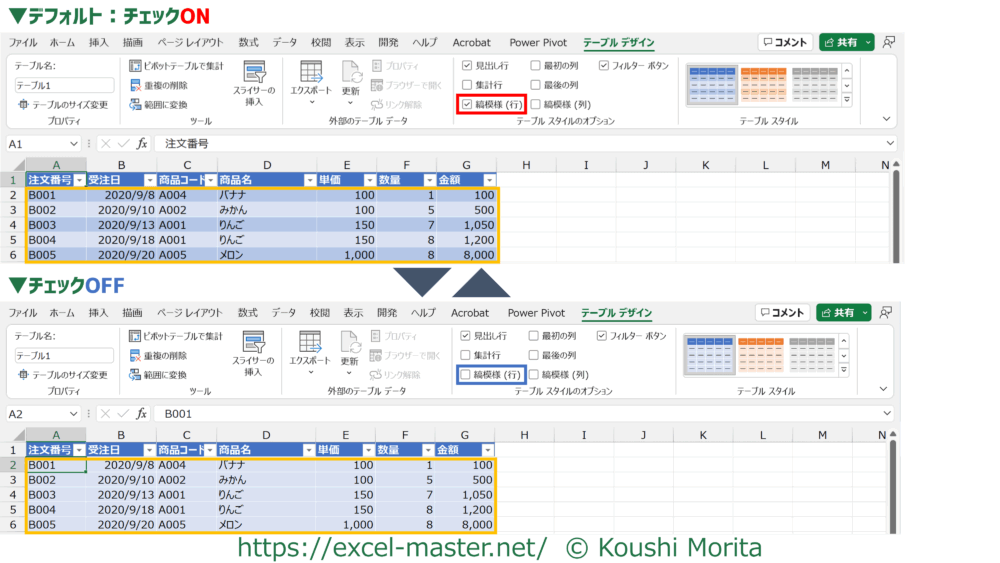 選択したテーブルスタイルによっては、このチェックがONでも変わらない場合があります。