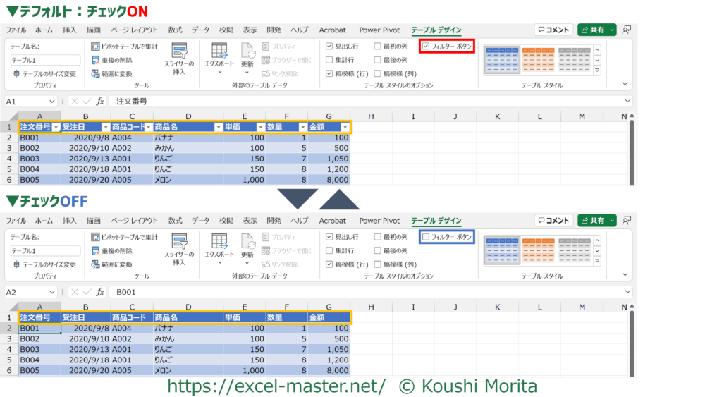 ただし、見出し行のデータが見にくい場合、一時的にフィルターボタンを非表示にするためにOFFにすると良いでしょう。(必要に応じてONに戻す)