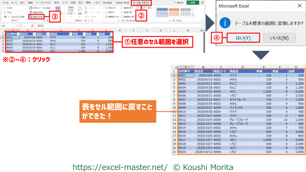 【参考】テーブルを通常のセル範囲へ戻すには
