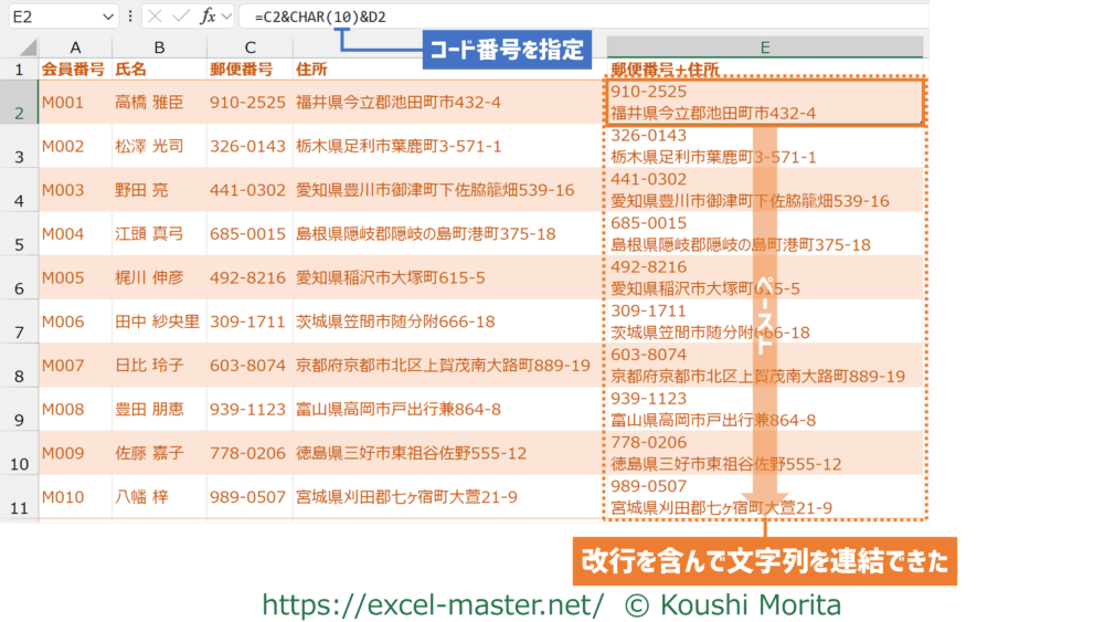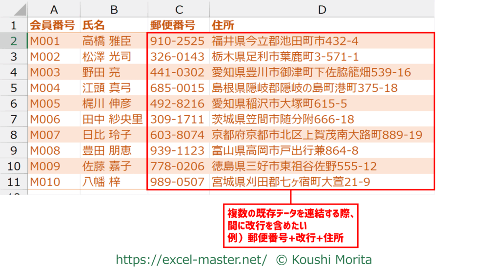 今回は「郵便番号」列と「住所」列の間に改行を含んで連結しました(郵便番号+改行+住所)。
