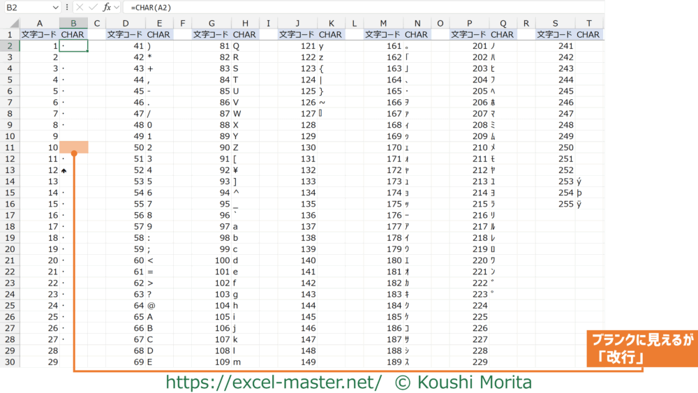 実務でCHARを使う際に頻出のコード番号は、上記で例に挙げた改行を示す「10」です。
