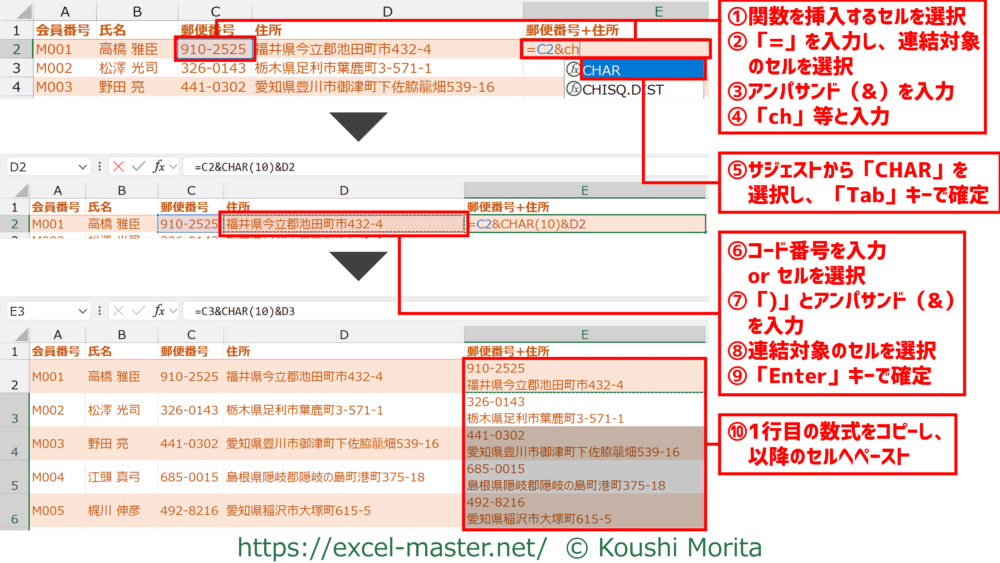 改行を含めて文字列を連結したい場合は「CHAR」が有効