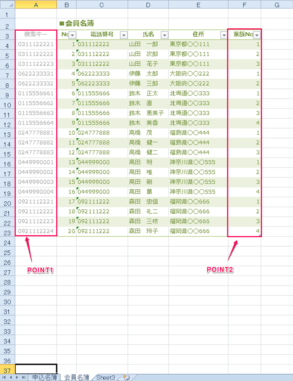 - POINT2:家族No.(同一電話番号内の通し番号)の作業列をつくる