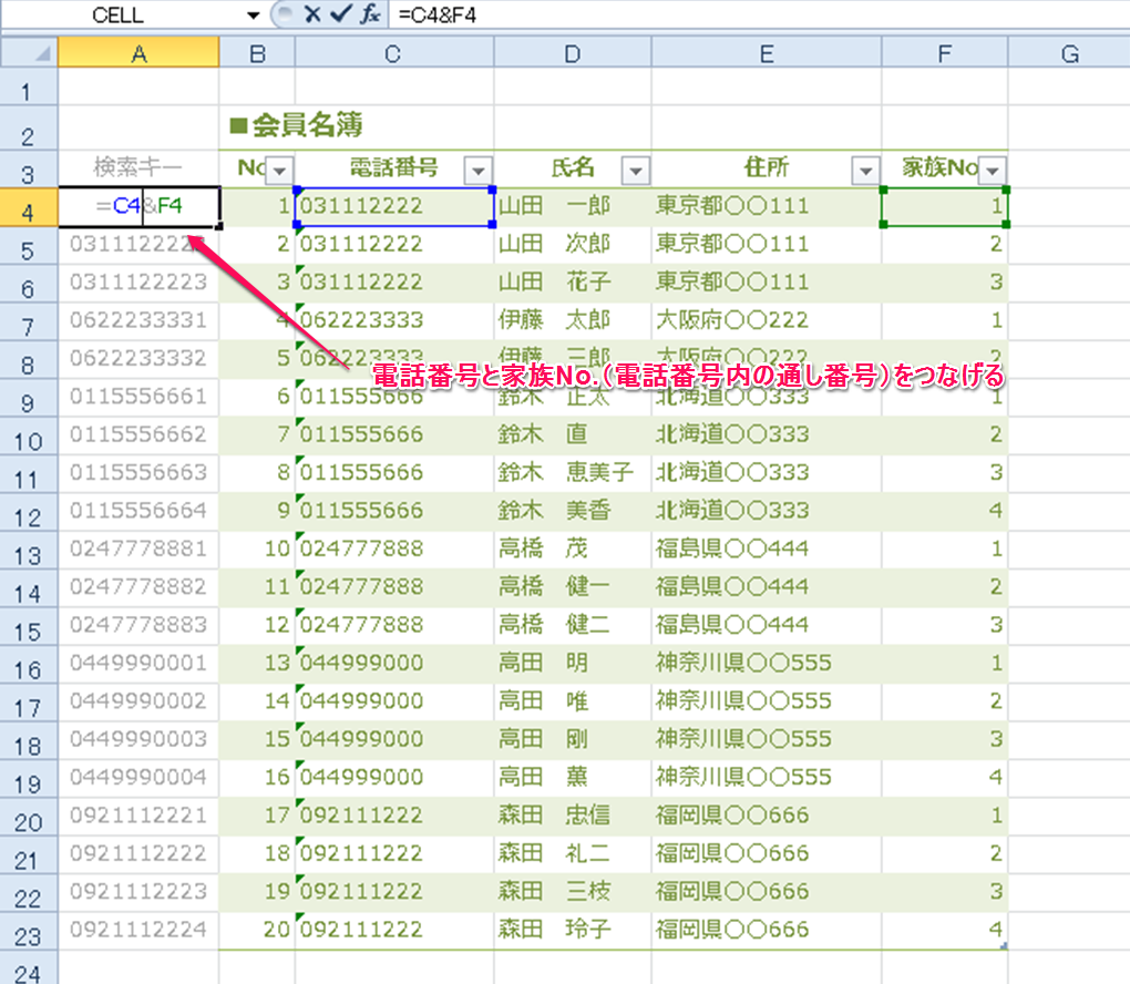 上図の例では「電話番号」がC列、「家族No.」がF列のため、A4セルなら「=C4&F4」となります。