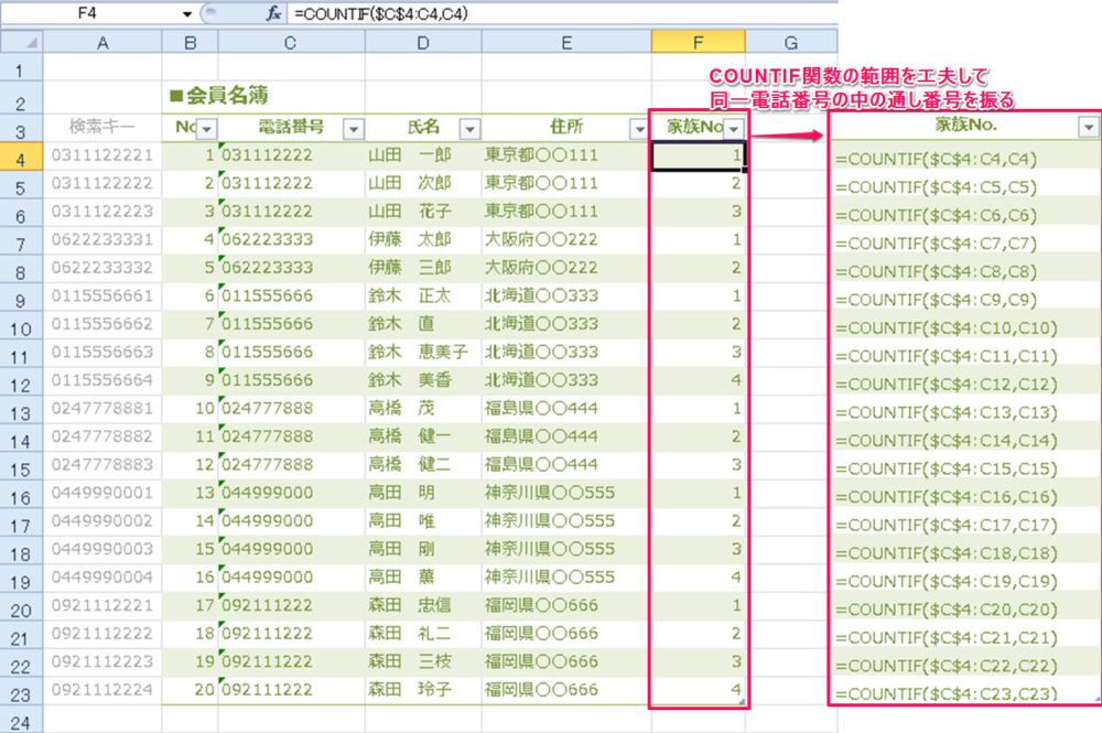 POINT2:家族No.(同一電話番号内の通し番号)の作業列をつくる