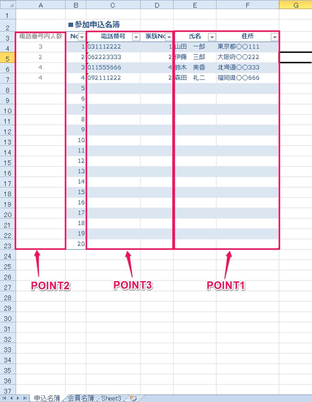 結論としては、会員名簿は2つのPOINT、参加申込名簿は3つのPOINTを組み込んで頂ければ実現できます。