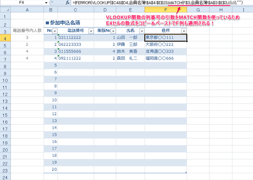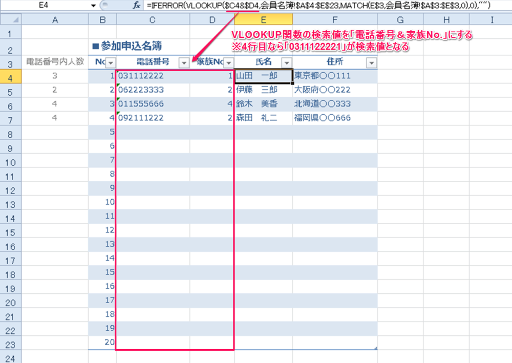 上図の例では「電話番号」がC列、「家族No.」がD列、会員情報となる「氏名」がE列、「住所」がF列以降となっており、E・F列にVLOOKUP関数を入れています。