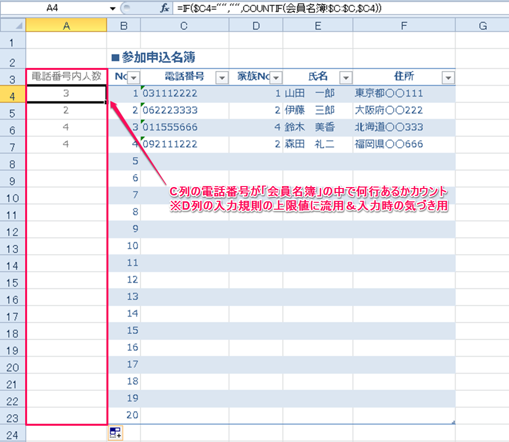 POINT2:該当の電話番号が「会員名簿」内に何行あるかカウントする作業列をつくる
