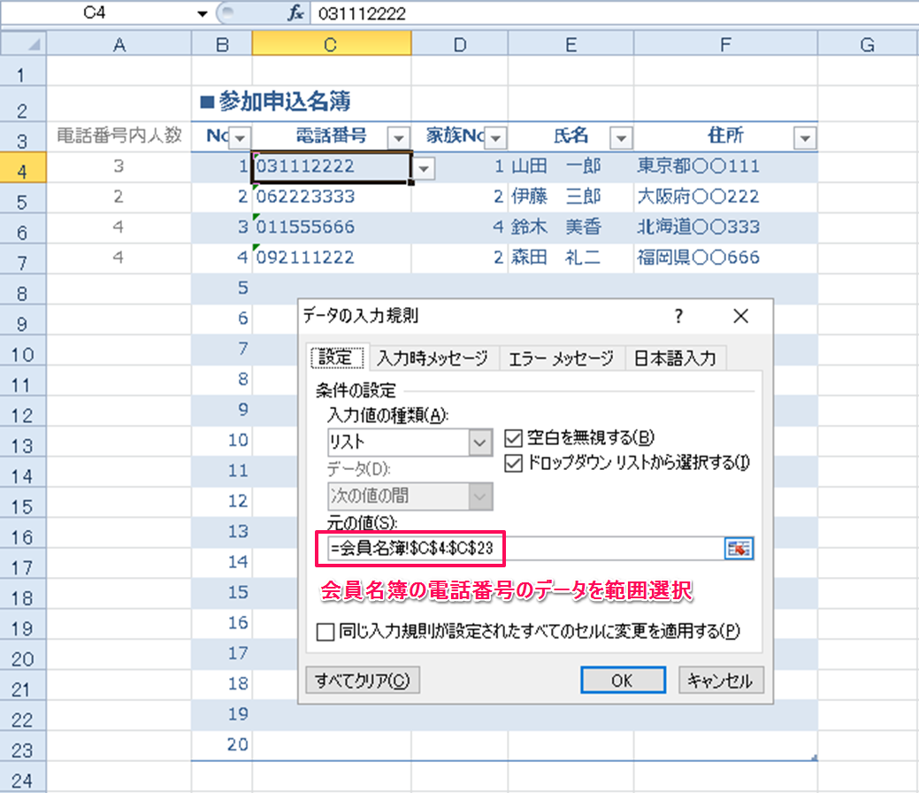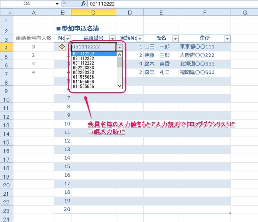 そうすることで、電話番号の何番目のデータを抽出したいのか入力するだけで該当の家族情報を会員名簿から参照することができます。