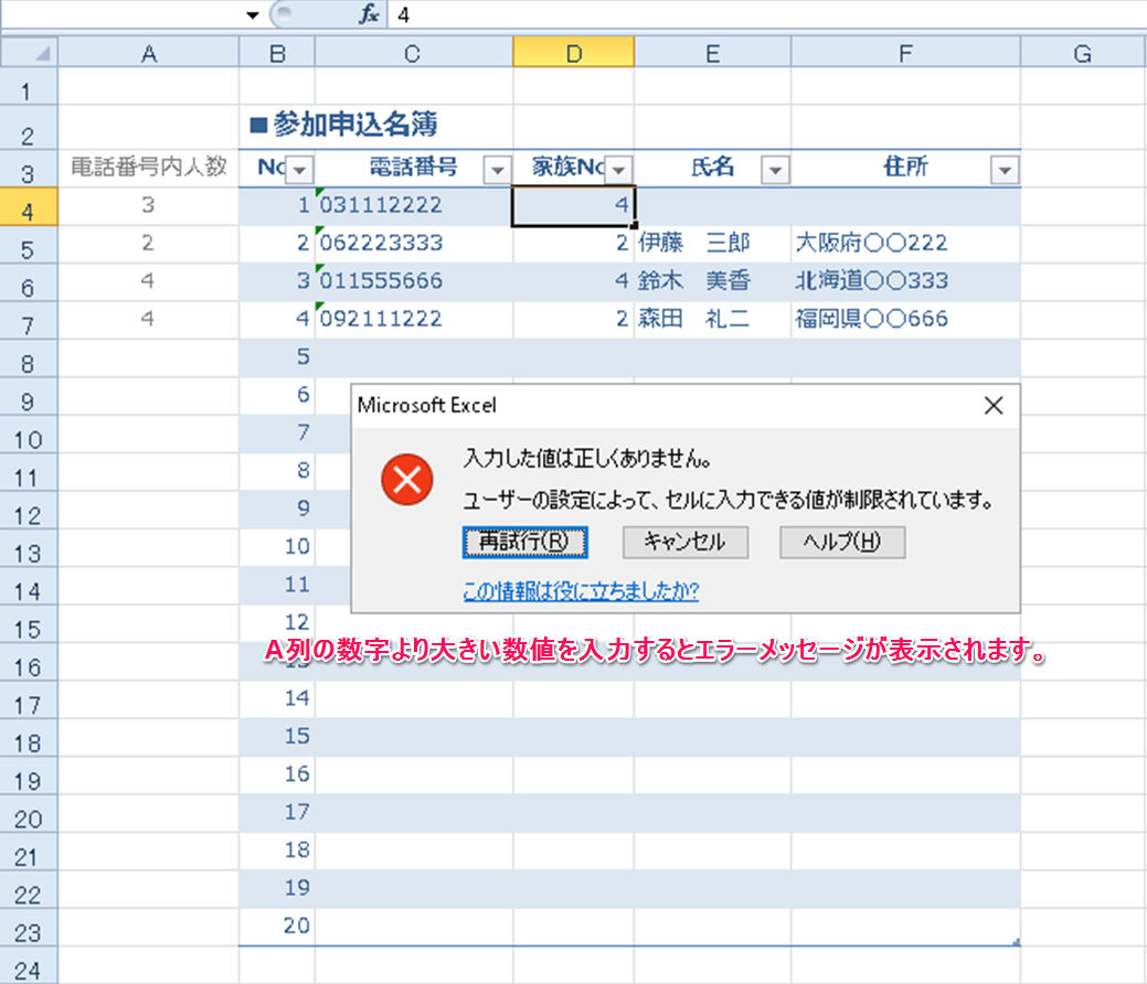 VLOOKUP関数の検索値となる「電話番号」「家族No.」の2つの列はそれぞれ入力規則をかけておくと、入力の断面でエラーを検知できるので設定しておくのがベターです。