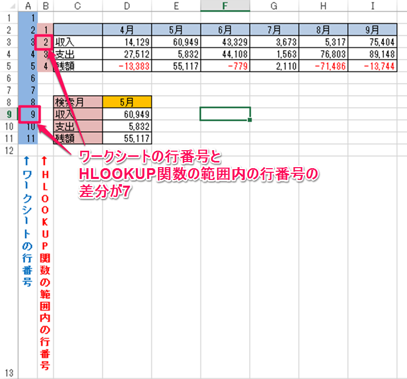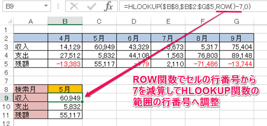 ただ、今回のHLOOKUP関数でB9セルで引用したいのは「範囲」の2行目のため、「9」と「2」の差分である「7」をROW関数から減算する必要があります。