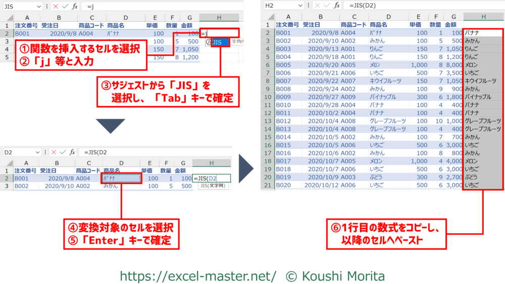 なお、JISは原則一つの関数で一つのセルのみが変換対象です。