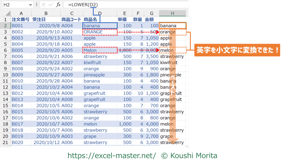 その場合は、関数の「LOWER」を活用すると良いですよ!