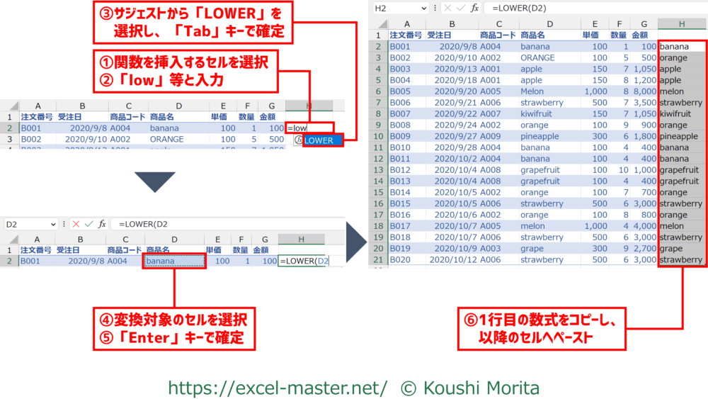 なお、LOWERは原則一つの関数で一つのセルのみが変換対象です。