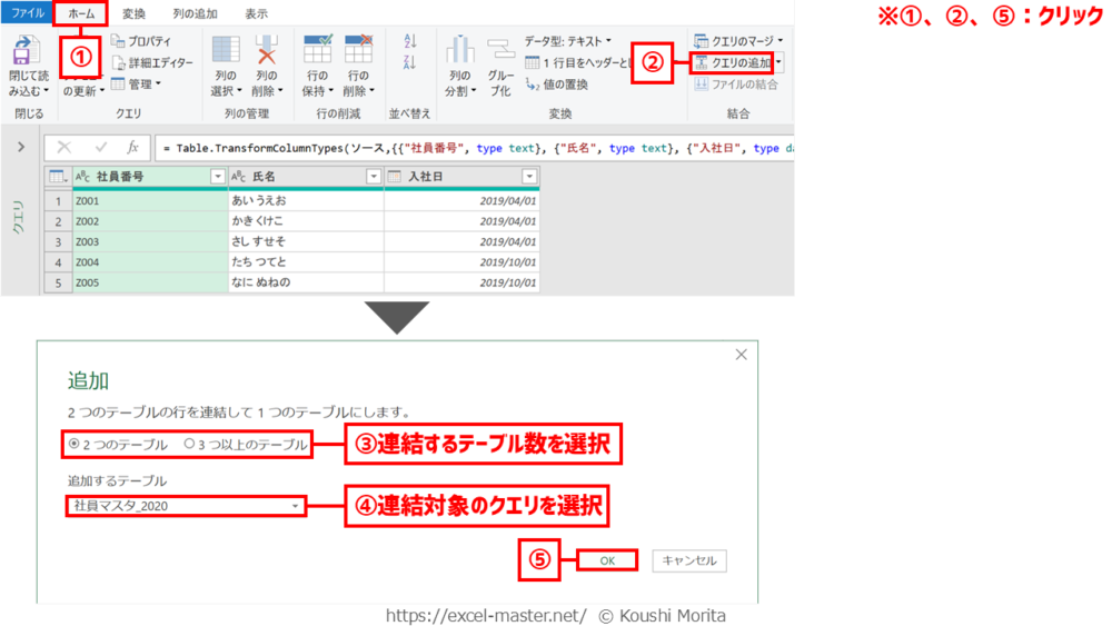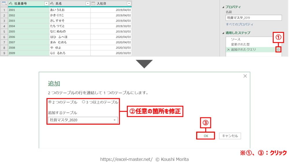 手順①のステップ名は、「クエリの追加」・「追加」コマンドのデフォルトの名前(自身でリネームしている場合は別表記)。