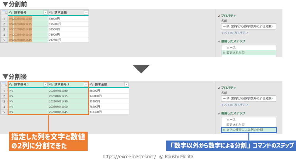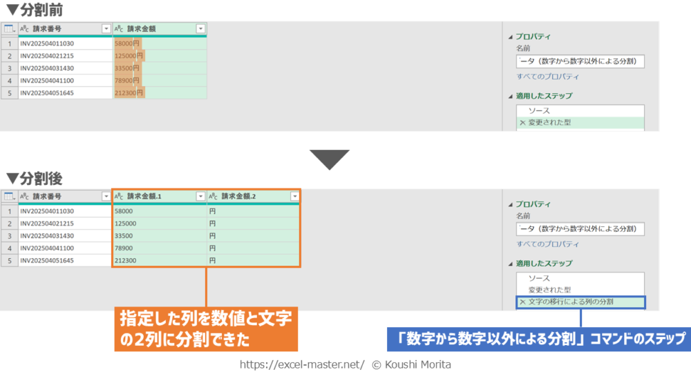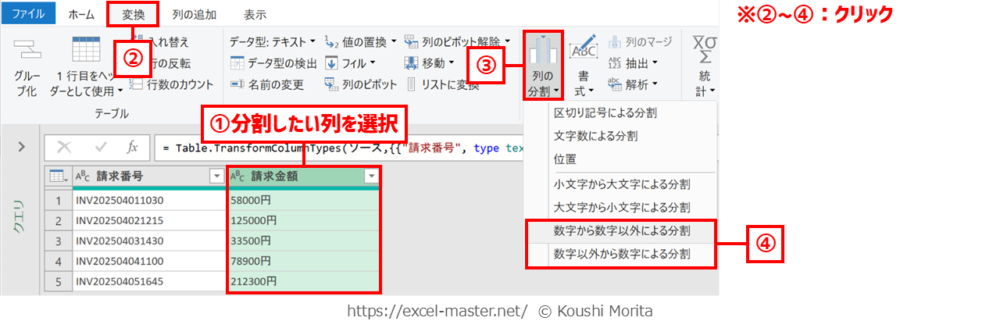 ブックを開いたら、「請求データ(数字から数字以外による分割)」クエリを編集(Power Queryエディター起動)し、次の手順を実施してください(今までの解説のまとめです)。