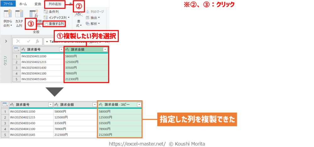 よって、前述のステップ登録手順①で選択した列を上書きしたくない場合、事前に「重複する列」コマンドで対象の列を複製しておきましょう。