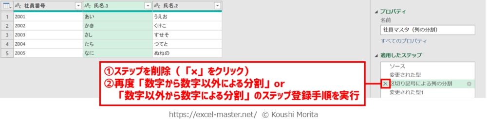 手順①のステップ名は、「数字から数字以外による分割」・「数字以外から数字による分割」コマンドのデフォルトの名前(自身でリネームしている場合は別表記)。