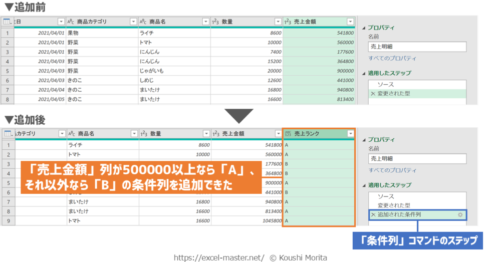 「売上明細」テーブルへ「売上金額」列が500000以上だったら「A」、それ以外は「B」となる条件列を追加したイメージが以下です。