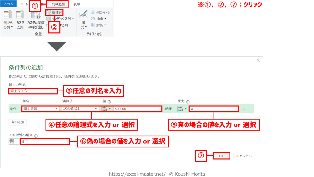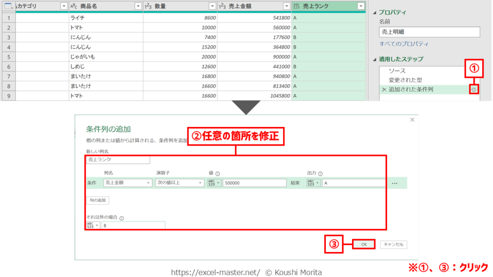 手順①のステップ名は「条件列」コマンドのデフォルトの名前(自身でリネームしている場合は別表記)。