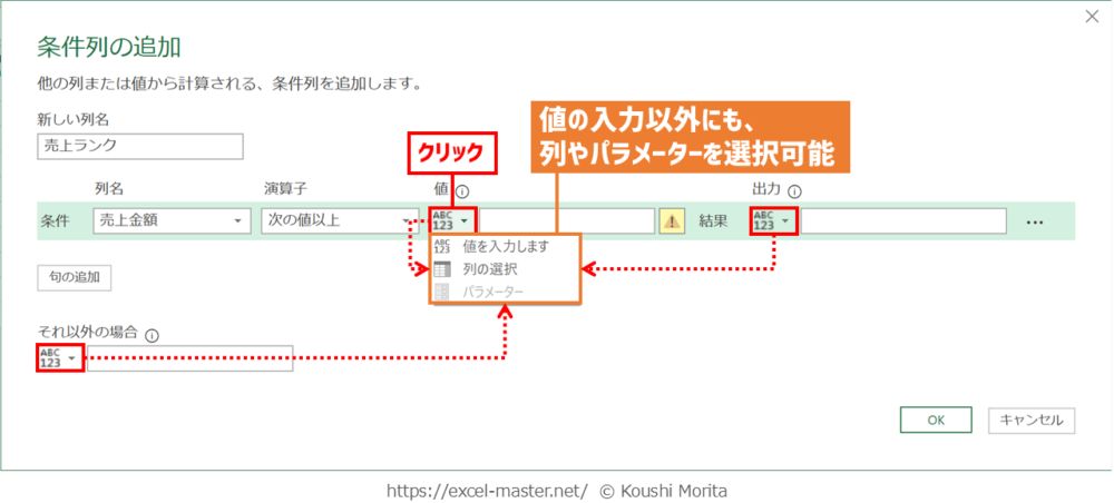 ステップ登録手順④⑤⑥に関係する「条件列の追加」ダイアログの「値」・「出力」・「それ以外の場合」ボックスは、「ABC123」をクリックすることで、値の入力以外にも、既存の列やパラメーターを選択することも可能です。
