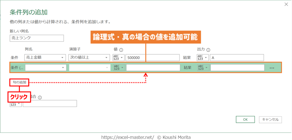 「条件列」コマンドは、2種類の条件分岐だけでなく、「句の追加」ボタンをクリックすることで3種類以上の条件分岐も対応可能です。