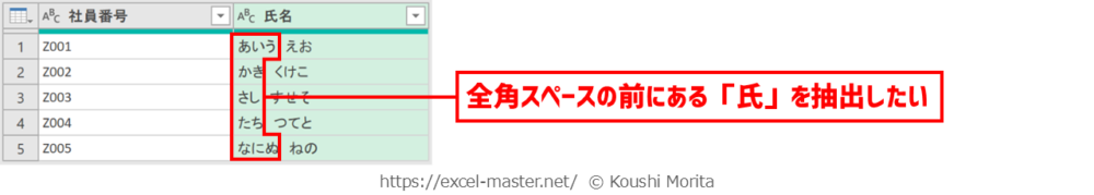 「氏名」列を対象に「区切り記号の前のテキスト」コマンドを使用し、全角スペースの前にある「氏」を抽出したイメージが以下です。