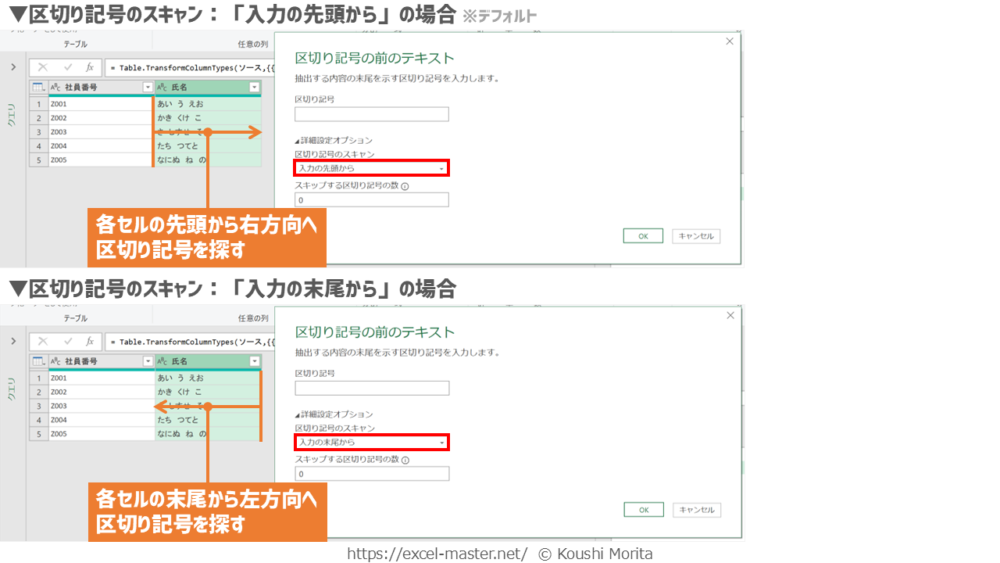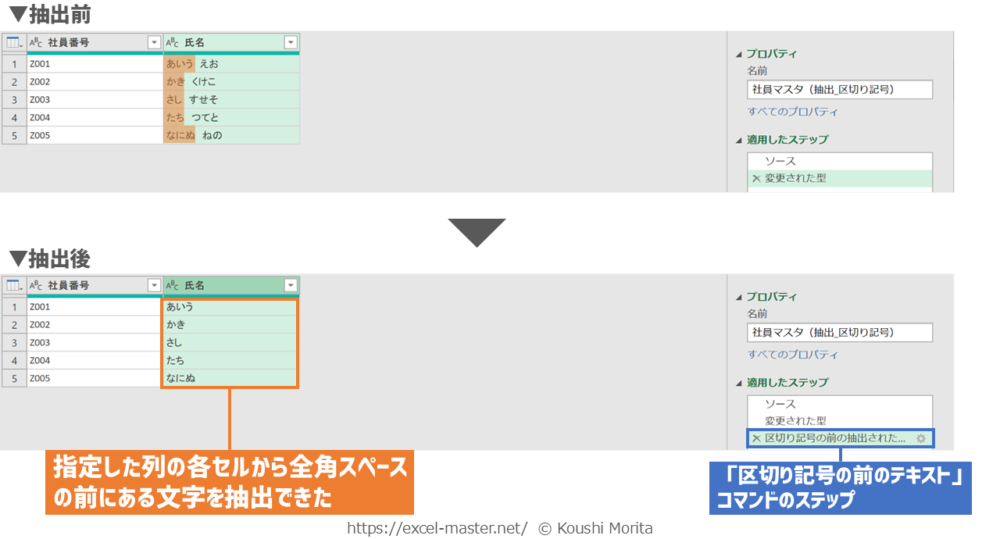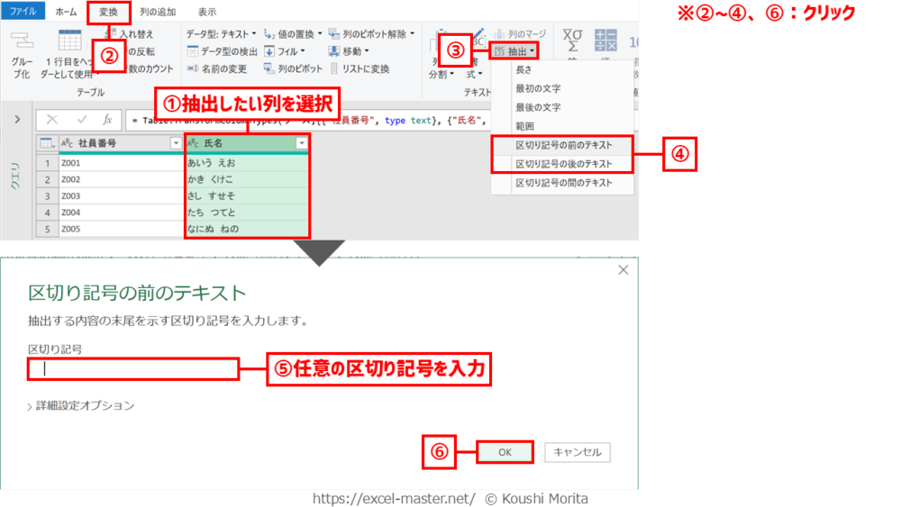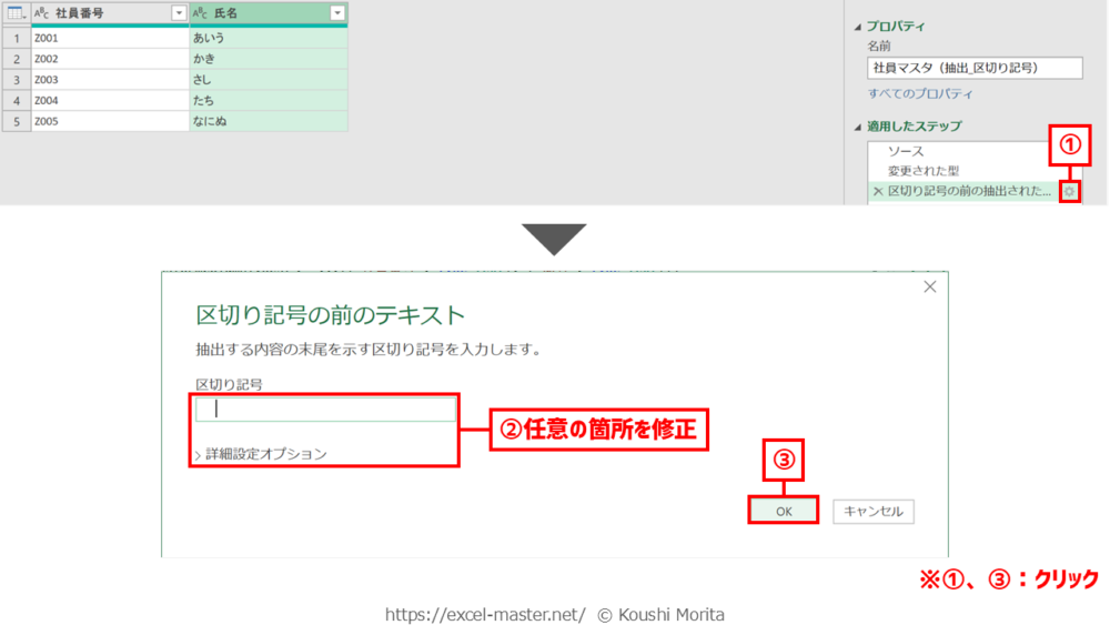 ブックを開いたら、「社員マスタ(抽出_区切り記号)」クエリを編集(Power Queryエディター起動)し、次の手順を実施してください(今までの解説のまとめです)。