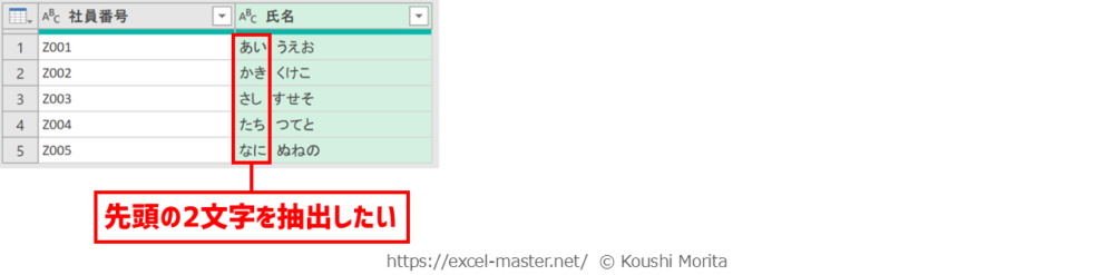 「氏名」列を対象に「最初の文字」コマンドを使用し、最初の2文字を抽出したイメージが以下です。