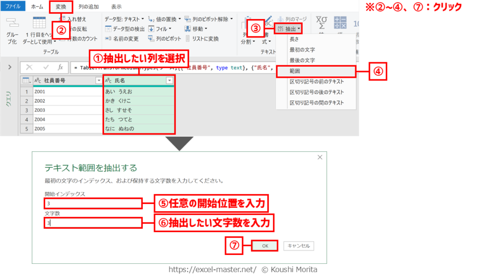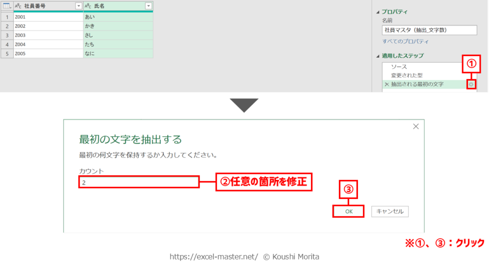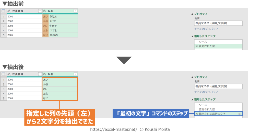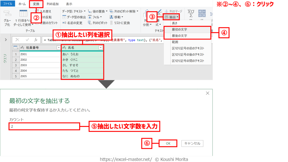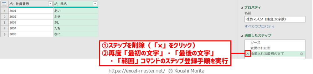 ブックを開いたら、「社員マスタ(抽出_文字数)」クエリを編集(Power Queryエディター起動)し、次の手順を実施してください(今までの解説のまとめです)。