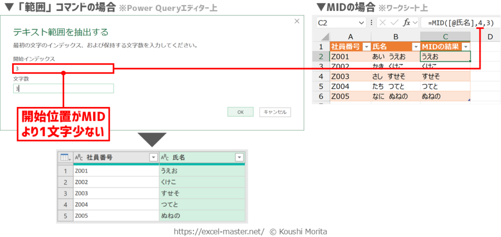 つまり、Power Queryエディター上の「範囲」コマンドを使う場合は、MID関数よりも1文字少なく開始位置を設定する必要があるので、ご注意ください。