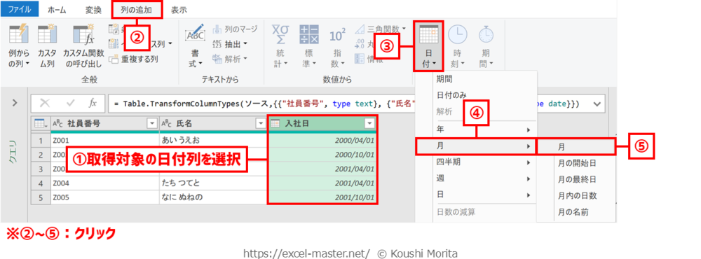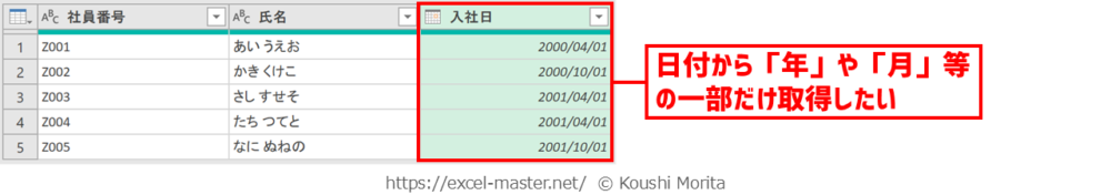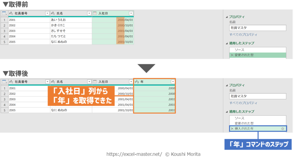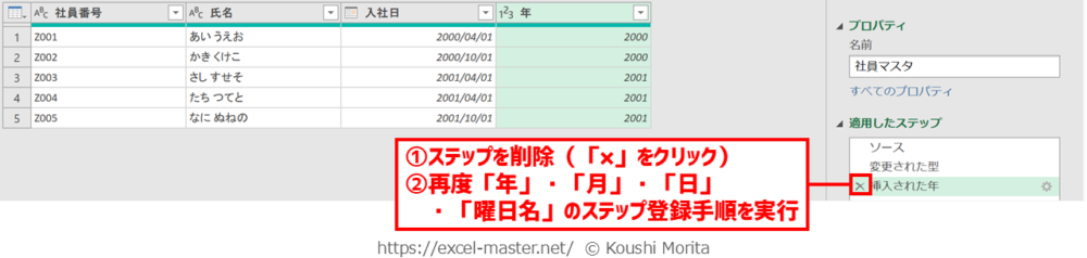 ブックを開いたら、「社員マスタ」クエリを編集(Power Queryエディター起動)し、次の手順を実施してください(今までの解説のまとめです)。