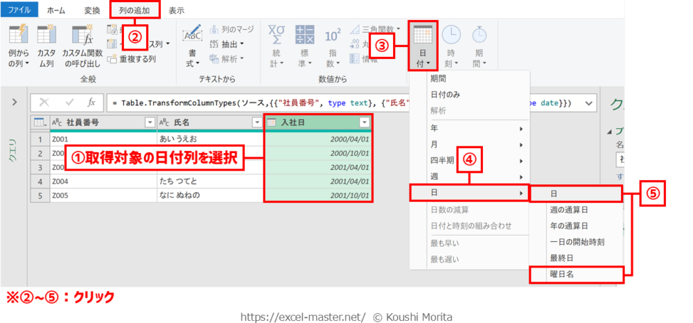 「年」・「月」・「日」・「曜日名」コマンドは、クエリの新規作成ステップのうち、STEP2の「取得データを整形/加工(Transform)」に該当する機能です。