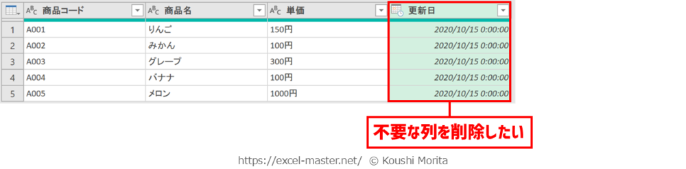 「更新日」列を「列の削除」コマンドで削除したイメージが以下です。