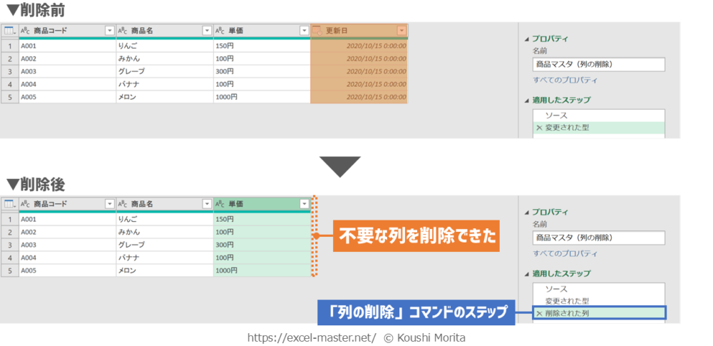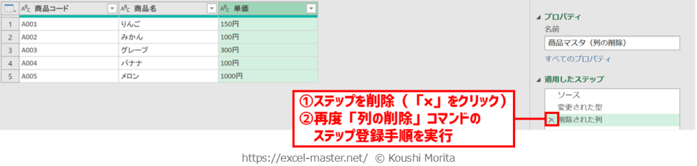 手順①のステップ名は、「列の削除」コマンドのデフォルトの名前(自身でリネームしている場合は別表記)。