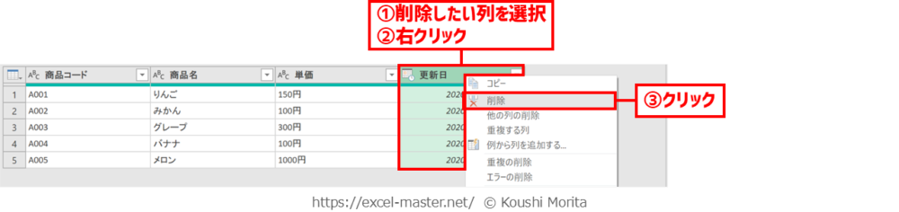 Power Queryエディター上で列を削除したい場合、どうしたら良いですか?