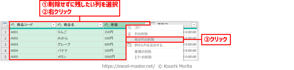 手順②③は、リボン「ホーム」をクリック→「列の削除」コマンドの下部をクリック→「他の列の削除」コマンドをクリックでもOK。