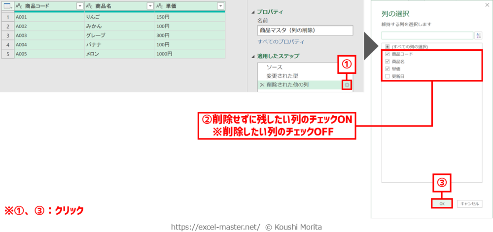 これにより、クエリに記録した「列の削除」・「他の列の削除」コマンドのステップを自動化できます。