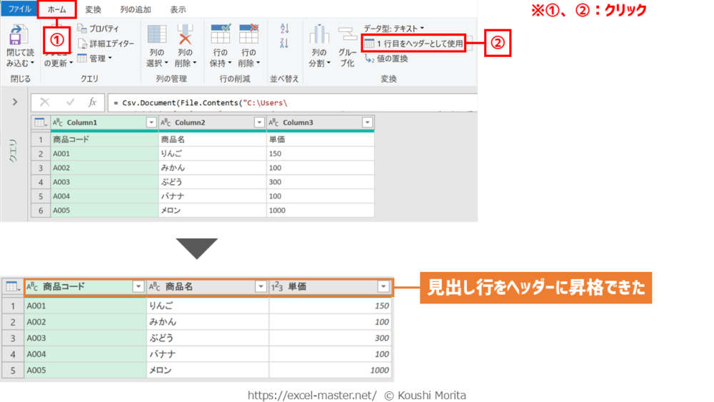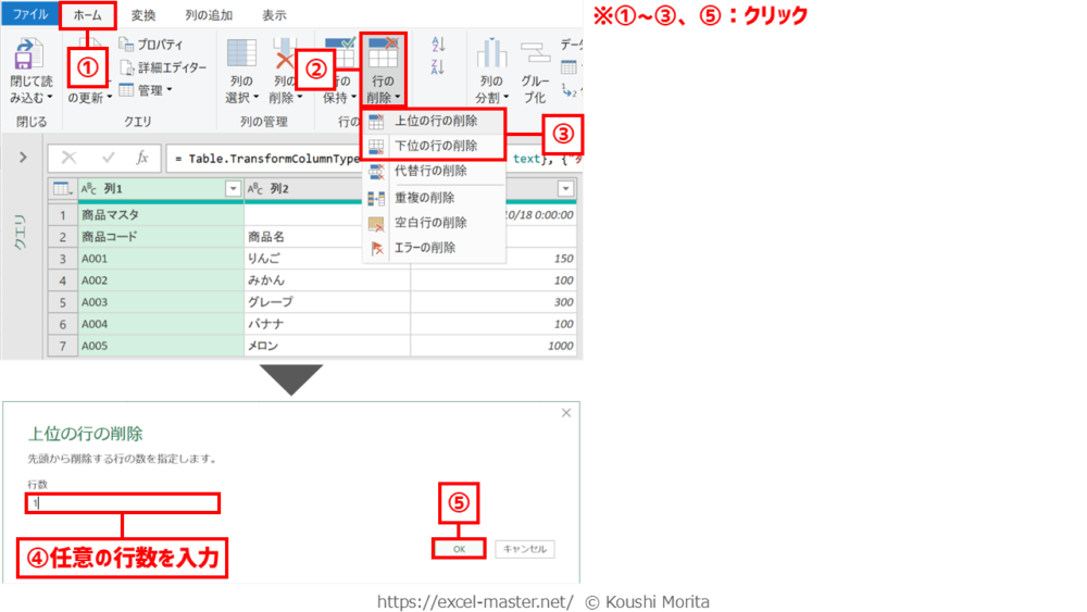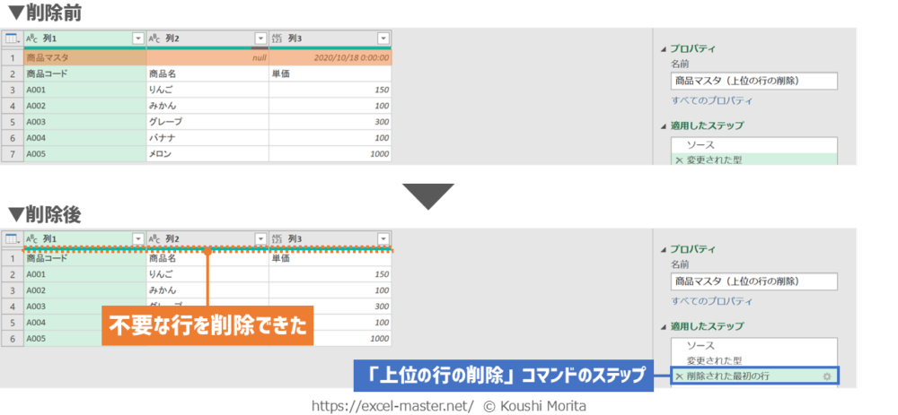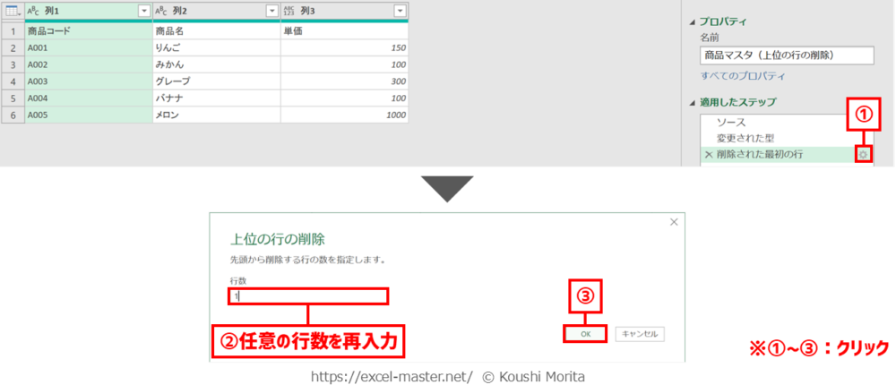 ブックを開いたら、「商品マスタ(上位の行の削除)」クエリを編集(Power Queryエディター起動)し、次の手順を実施してください(今までの解説のまとめです)。