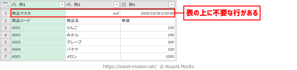 クエリのデータソースをテーブル以外のテキスト/CSVファイル等にした場合、整形したい表データの上下にある余計な行までPower Queryエディター上で取得してしまう場合があります。