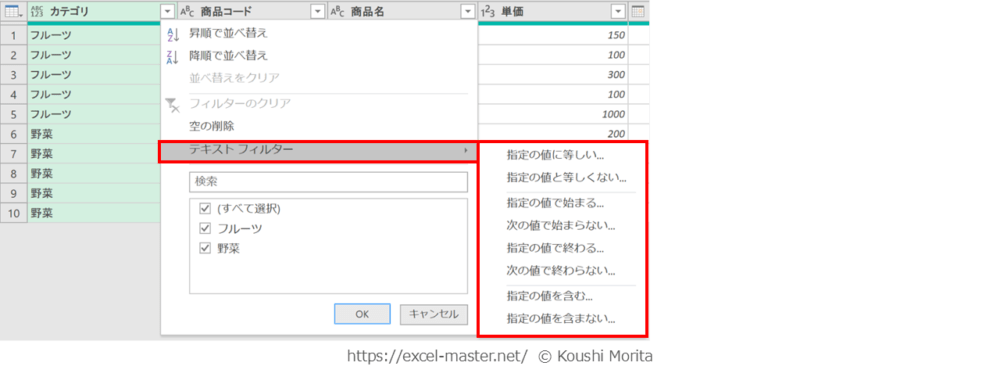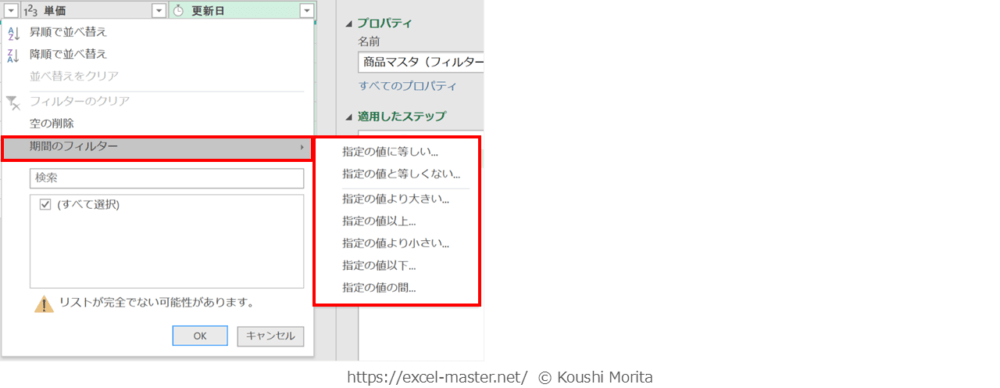 フィルターのステップ登録手順②のフィルターの種類は、手順①の列のデータ型によって変化します。