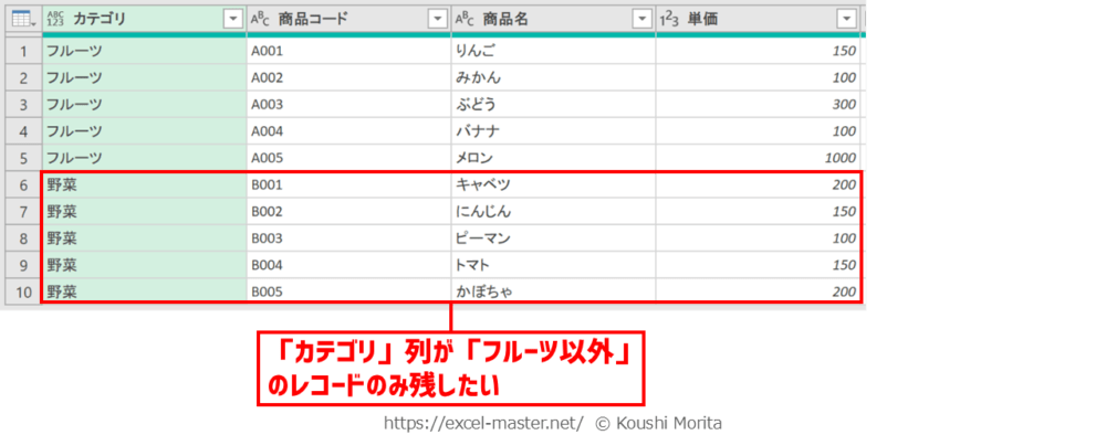 「カテゴリ」列を対象にフィルターを使用し、「フルーツ」と等しくないレコードのみを残し、それ以外を削除したイメージが以下です。