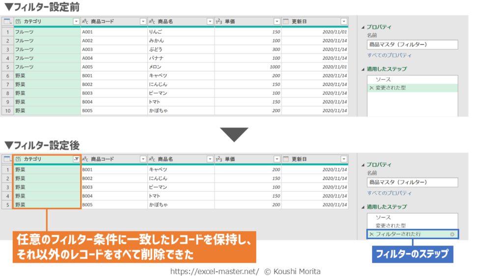 ブックを開いたら、「商品マスタ(フィルター)」クエリを編集(Power Queryエディター起動)し、次の手順を実施してください(今までの解説のまとめです)。