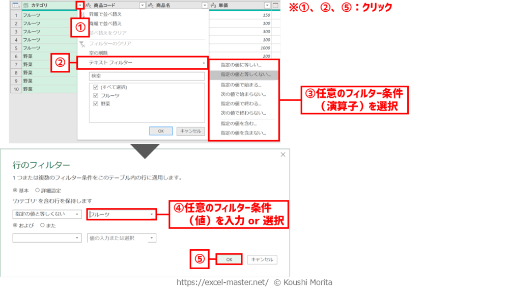 手順②~④は、今後手順①の列に新たな値(アイテム)が追加されても問題ないフィルター条件を設定すること。