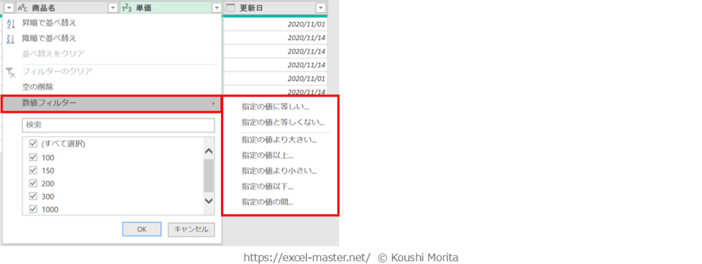 データ型が「10進法」、「通貨」、「整数」、「パーセンテージ」の場合は「数値フィルター」です。