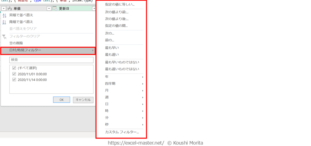 データ型が「日付」の場合は「日付フィルター」です。