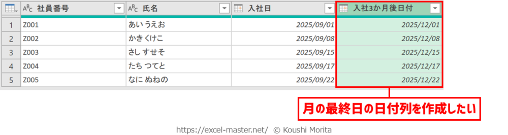 「入社3か月後日付」列から「契約満了日」列を作成したイメージが以下です。