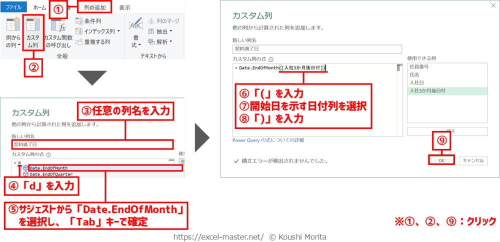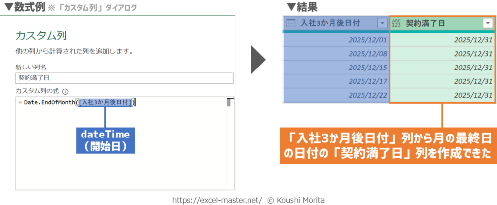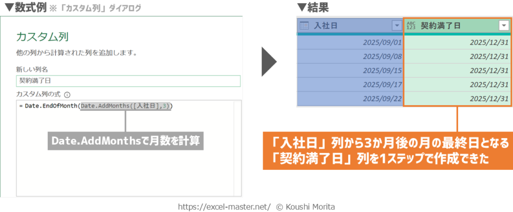 この場合、「カスタム列」ダイアログ上の数式で「Date.EndOfMonth」と「Date.AddMonths」を組み合わせれば、EOMONTHと同じことをPower Queryエディター上の1ステップで実現できます。