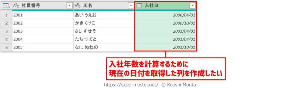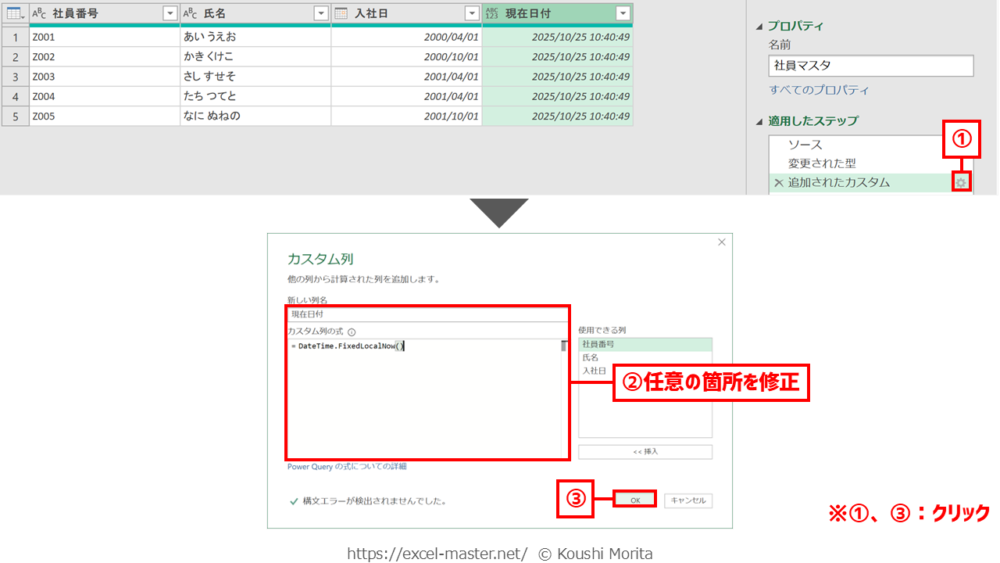 ブックを開いたら、「社員マスタ」クエリを編集(Power Queryエディター起動)し、次の手順を実施してください(今までの解説のまとめです)。