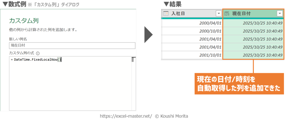 Power Queryエディター上で現在の日付/時刻列を作成したい場合、「カスタム列」ダイアログ上で「DateTime.FixedLocalNow」を活用しましょう。